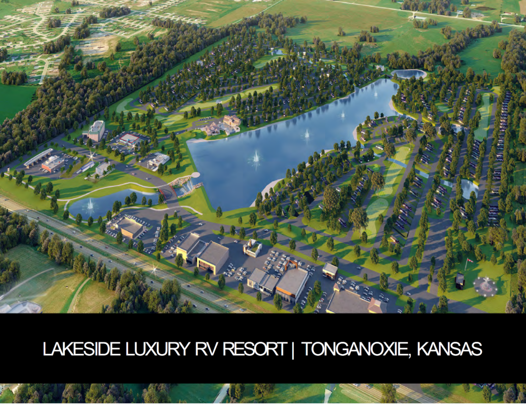 A Luxury Five Star, five-hundred-site hybrid RV and Tiny Home Resort on 153 acres, with a 15-acre clear fishing lake within the city limits of Tonganoxie Kansas with city utilities. The property is designed with twelve General Business District lots on the frontage of Highway 2440, a four-lane highway. Located just twelve minutes and twelve miles from The Legends Outlet Kansas City – featuring the Nascar Raceway, Children’s Mercy Park Soccer Stadium, the new Kansas City Chiefs Stadium in the next two years, the Hollywood Casino, 110 retail stores and many restaurants.